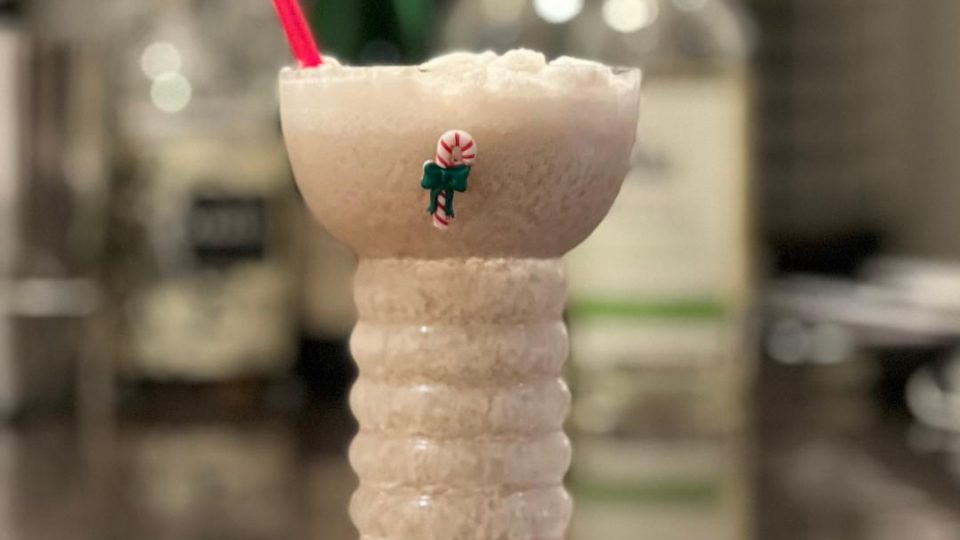 I happen to have Polynesian Pearl Diver glasses, which are perfect. But since we’re blending this with ice, use whatever you’d put a frozen margarita in.